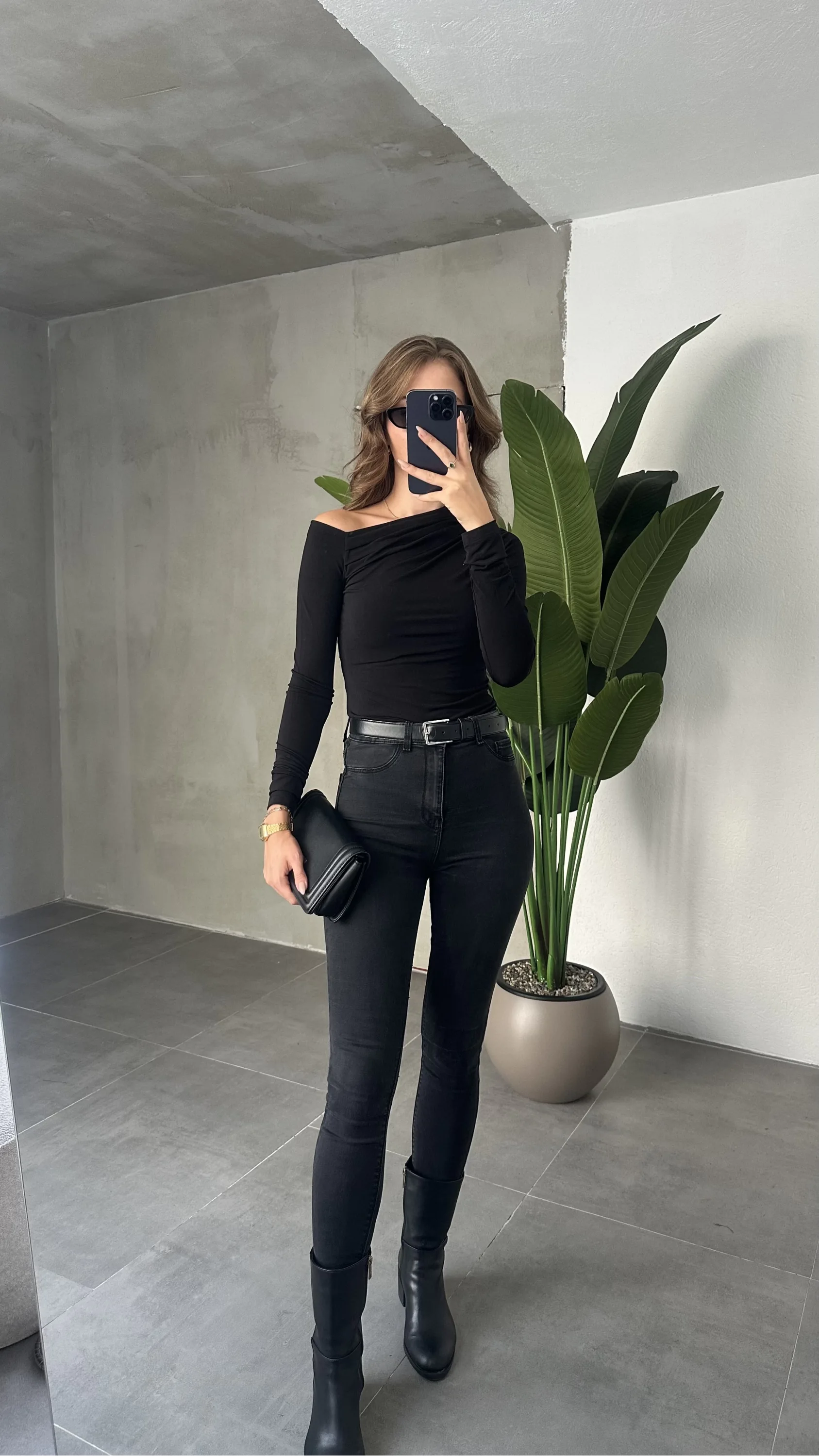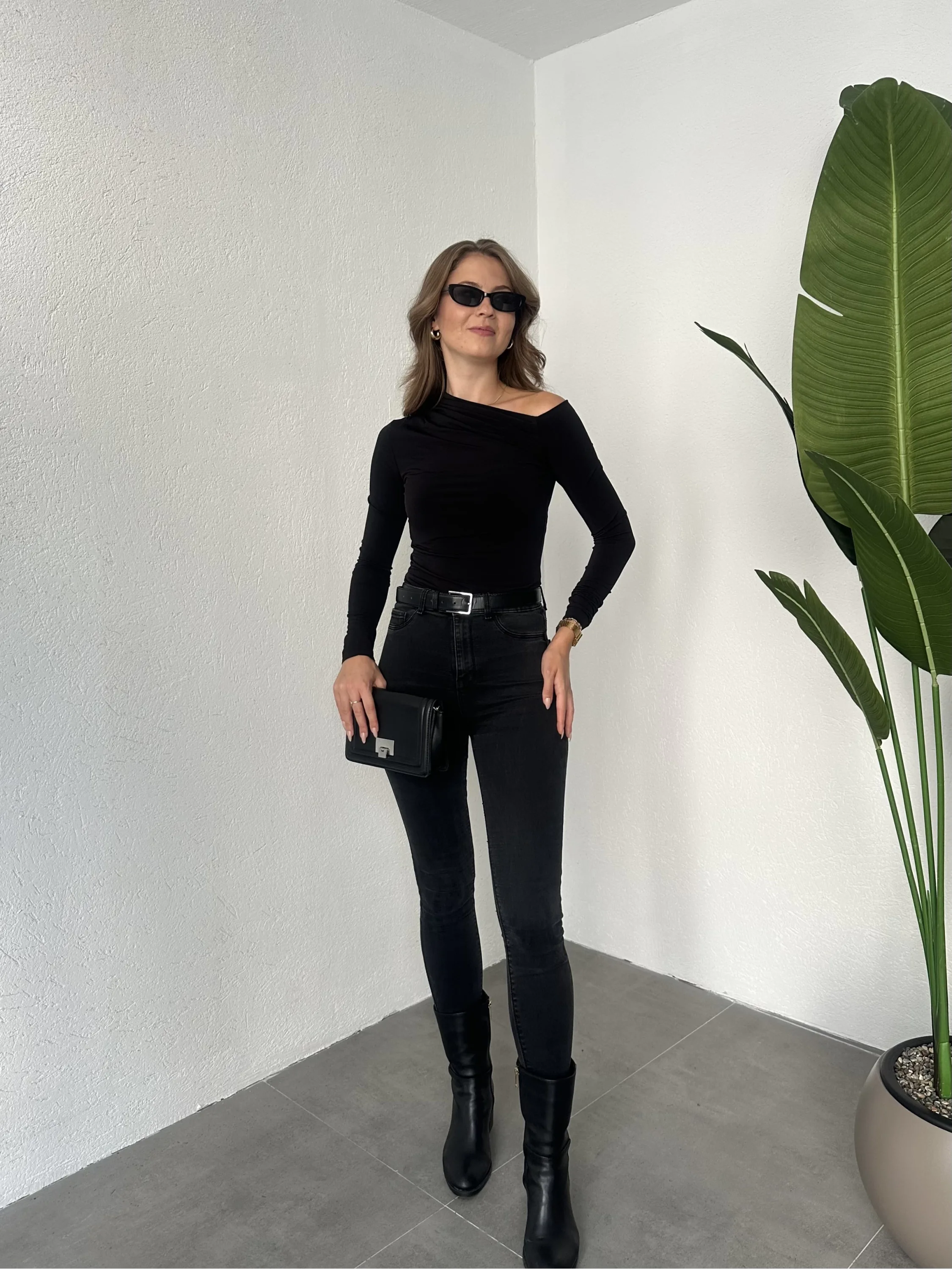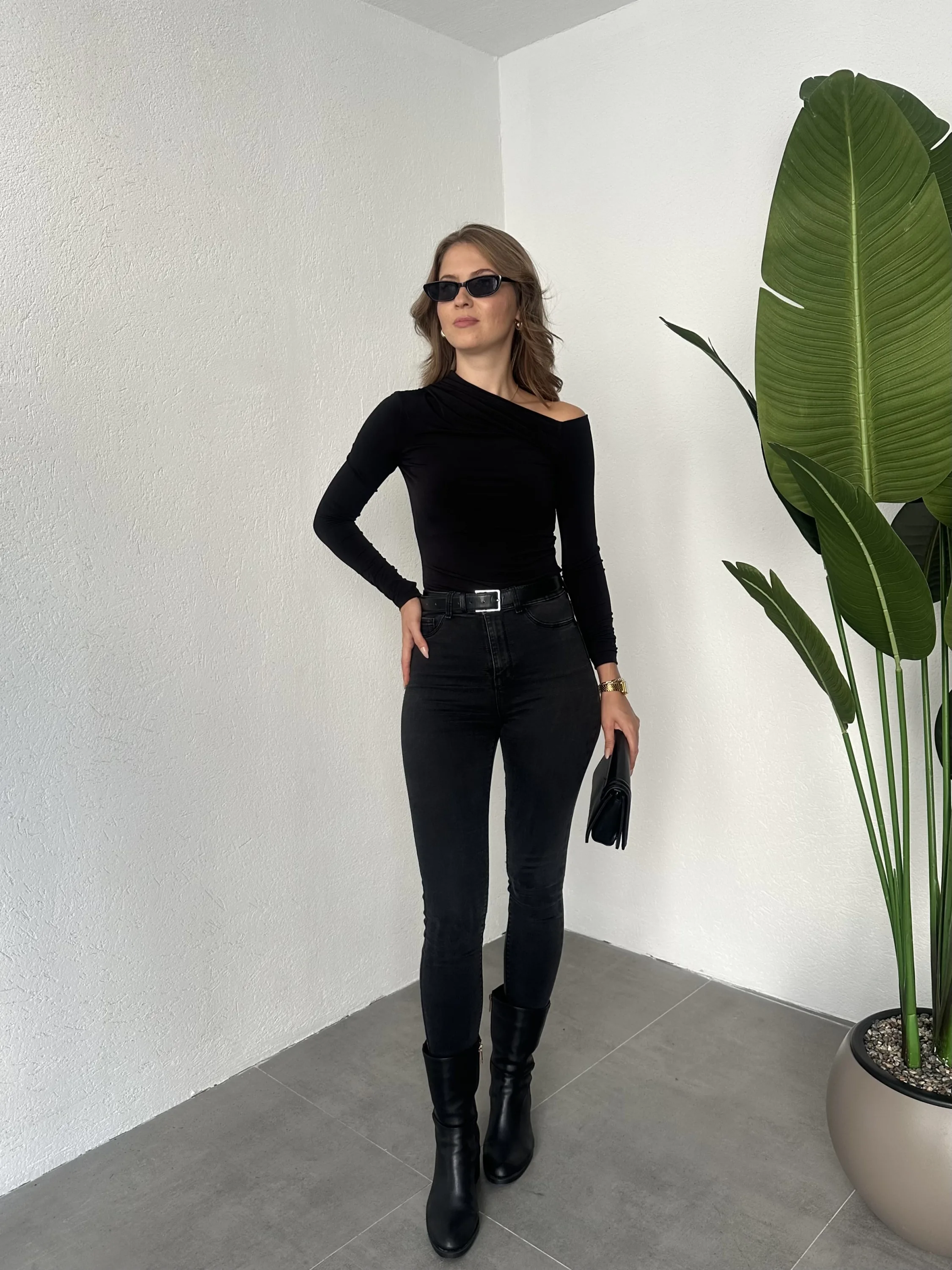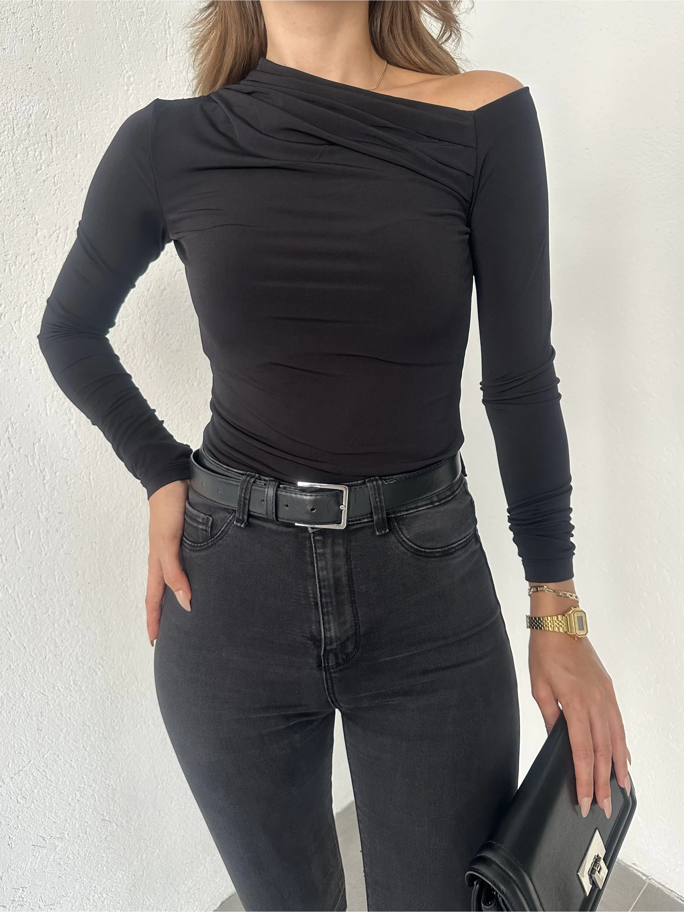 Siyah Tek Omuz Kayık Yaka Büzgülü Parmak Geçirmeli Body Bluz