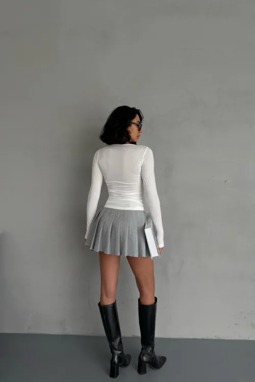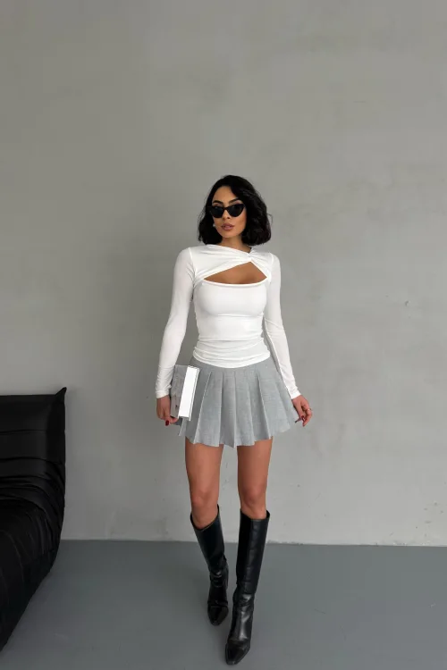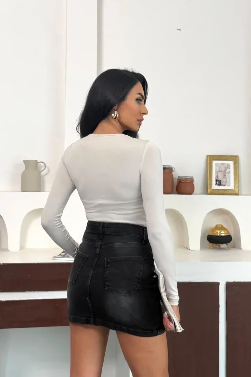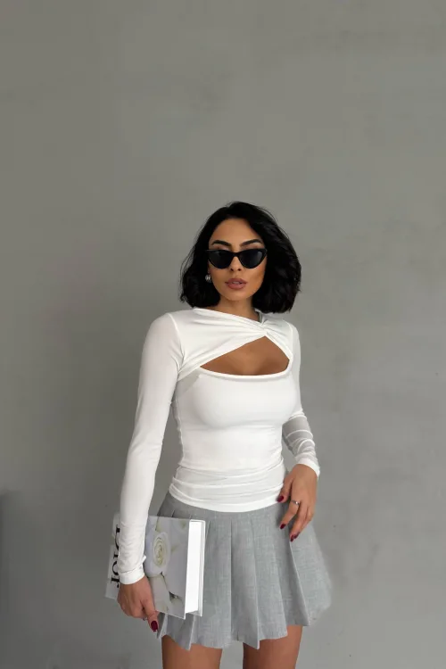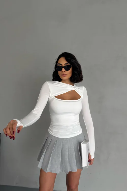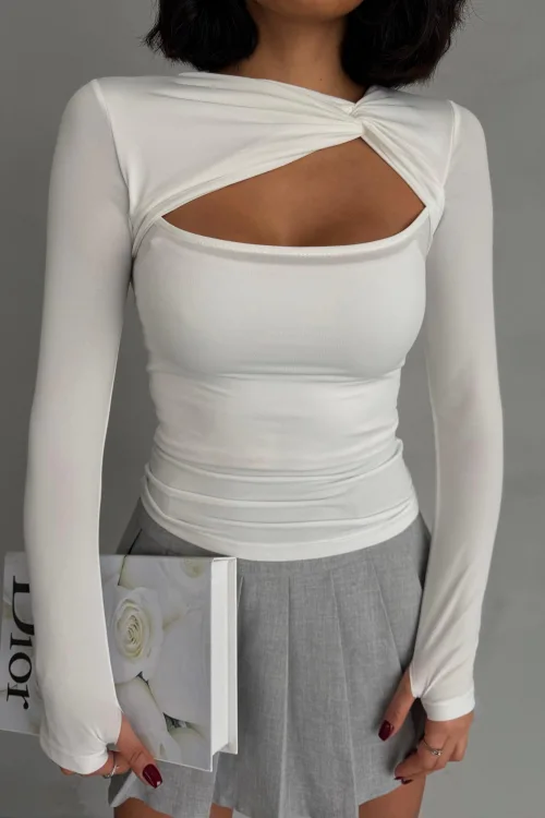 Beyaz Burgu Detaylı Dekolteli Parmak Geçirmeli Body Bluz