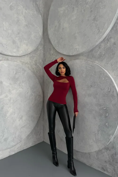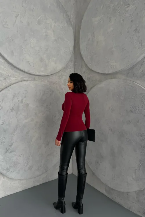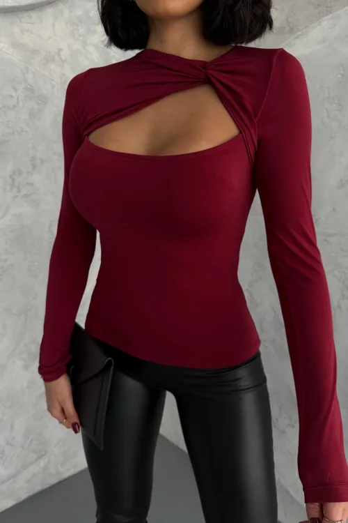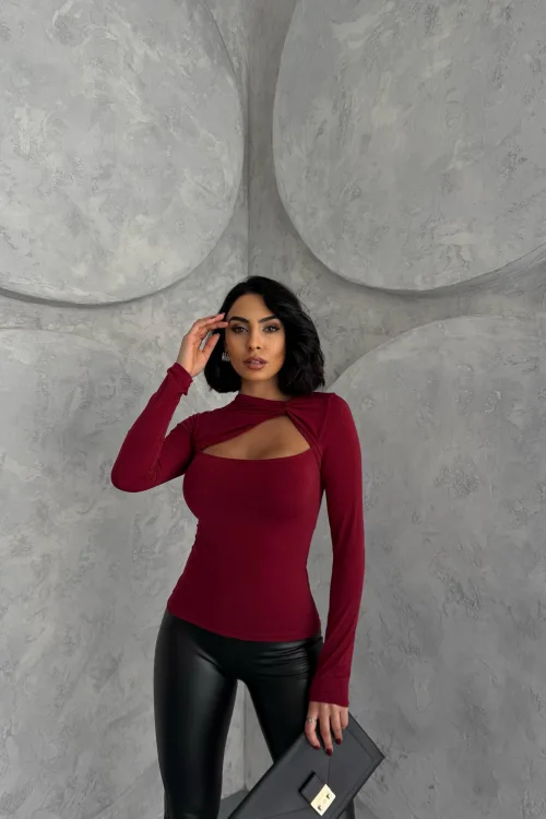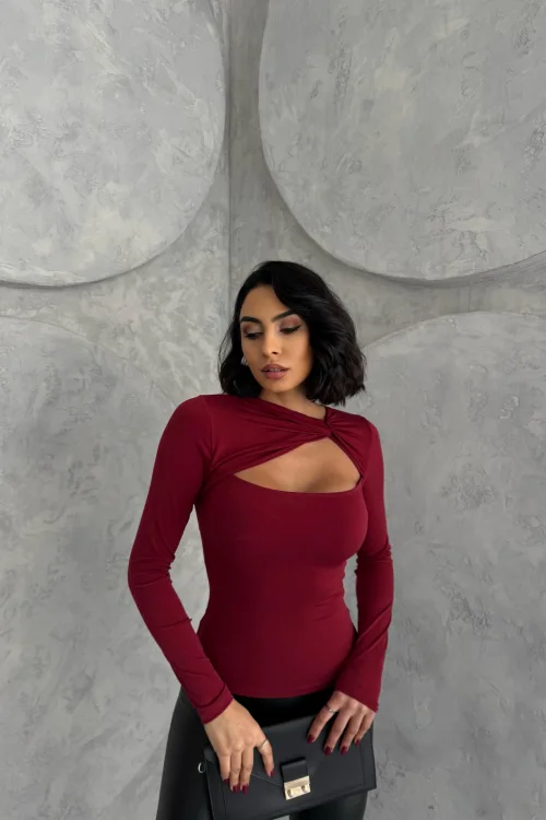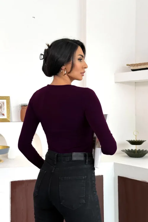 Bordo Burgu Detaylı Dekolteli Parmak Geçirmeli Body Bluz