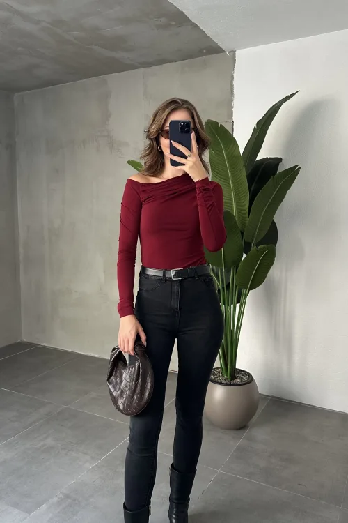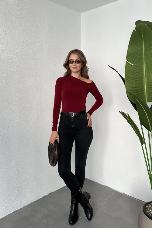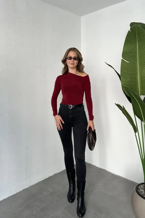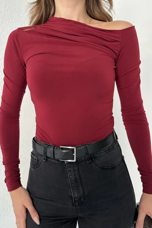 Bordo Tek Omuz Kayık Yaka Büzgülü Parmak Geçirmeli Body Bluz