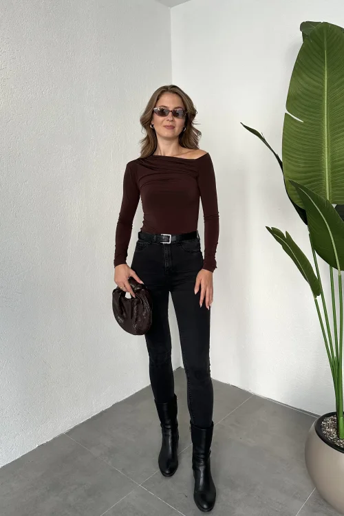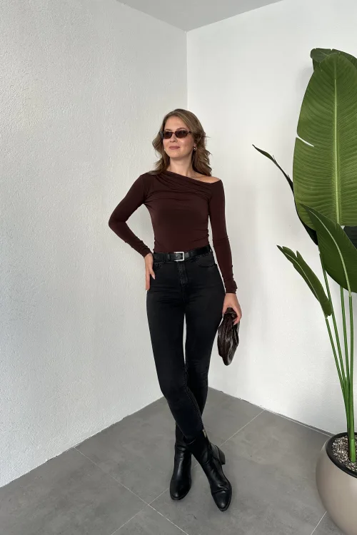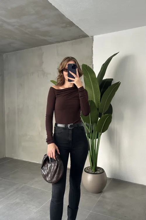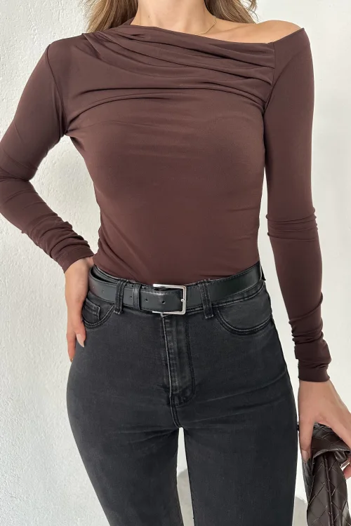 Kahverengi Tek Omuz Kayık Yaka Büzgülü Parmak Geçirmeli Body Bluz