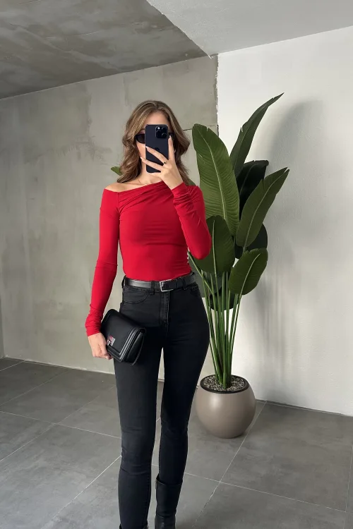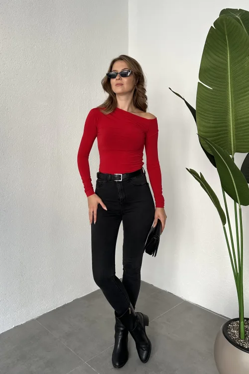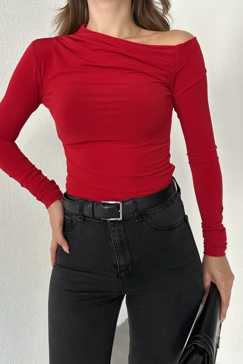 Kırmızı Tek Omuz Kayık Yaka Büzgülü Parmak Geçirmeli Body Bluz