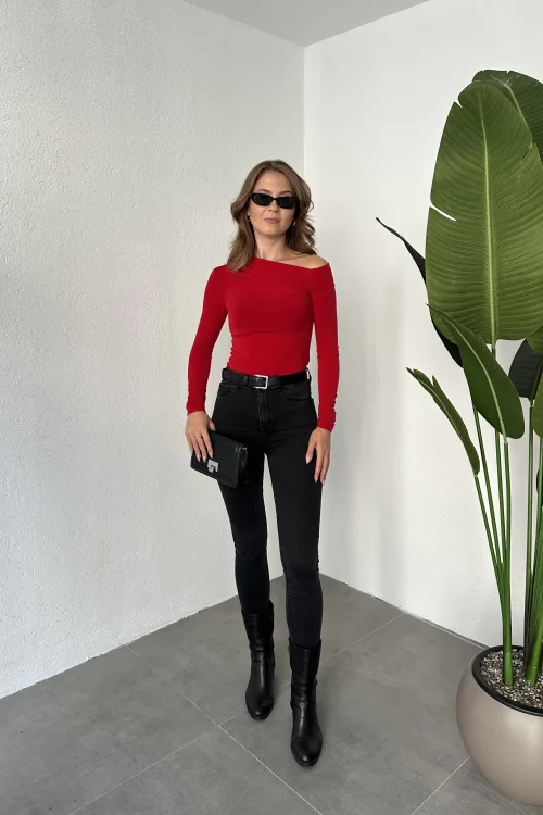 Kırmızı Zr Model Asimetrik Kesim Drapeli Büzgülü Candy Body Bluz