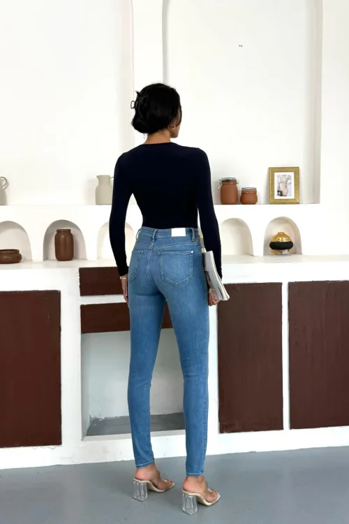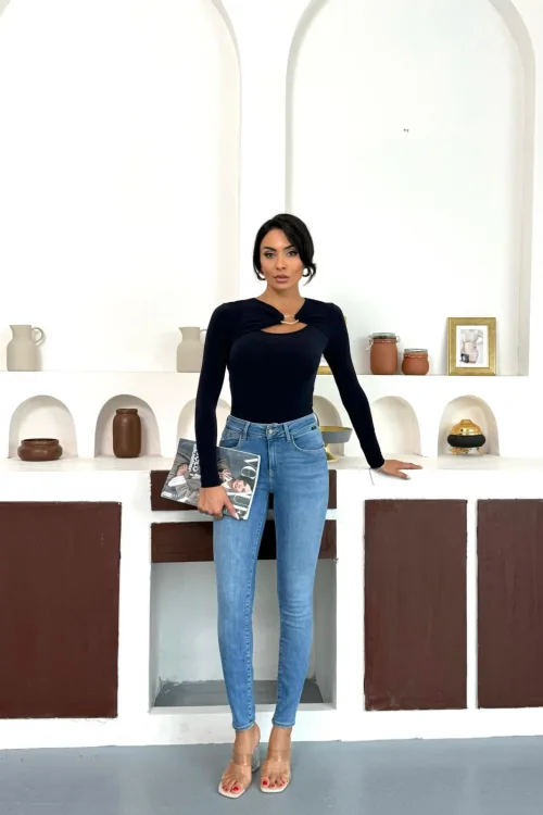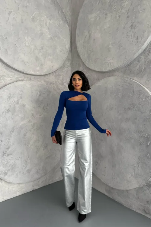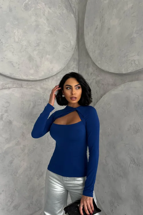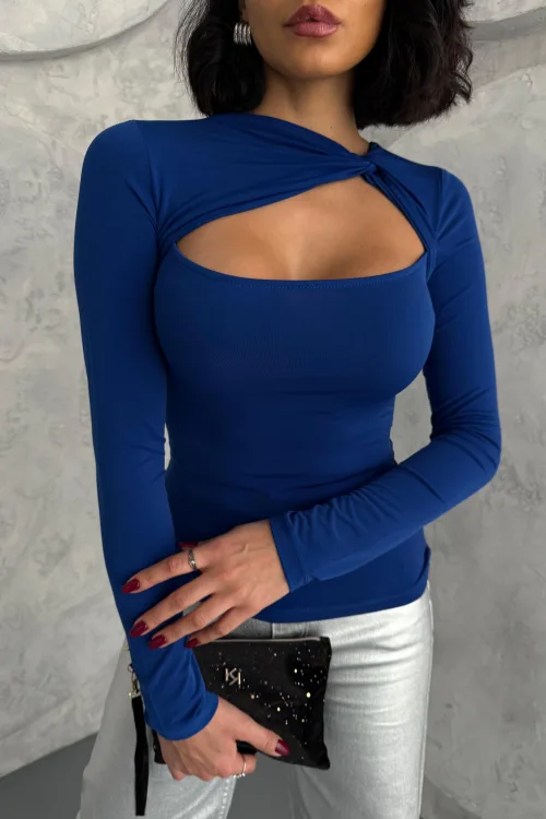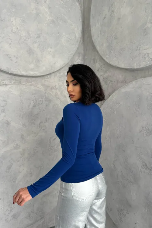 Saks Mavisi Burgu Detaylı Dekolteli Parmak Geçirmeli Body Bluz