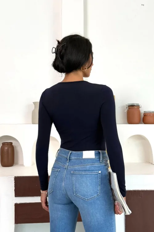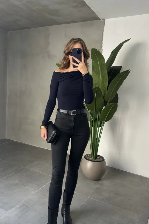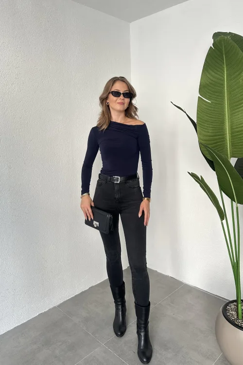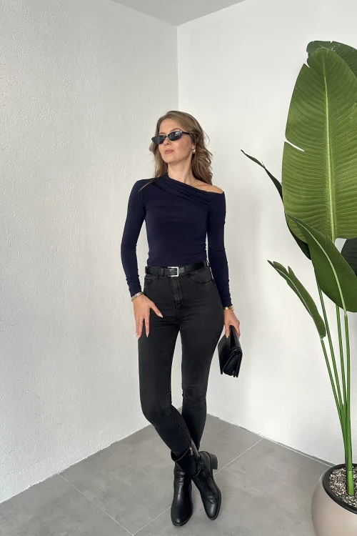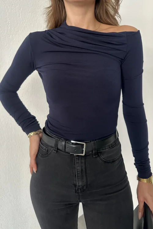 Lacivert Tek Omuz Kayık Yaka Büzgülü Parmak Geçirmeli Body Bluz