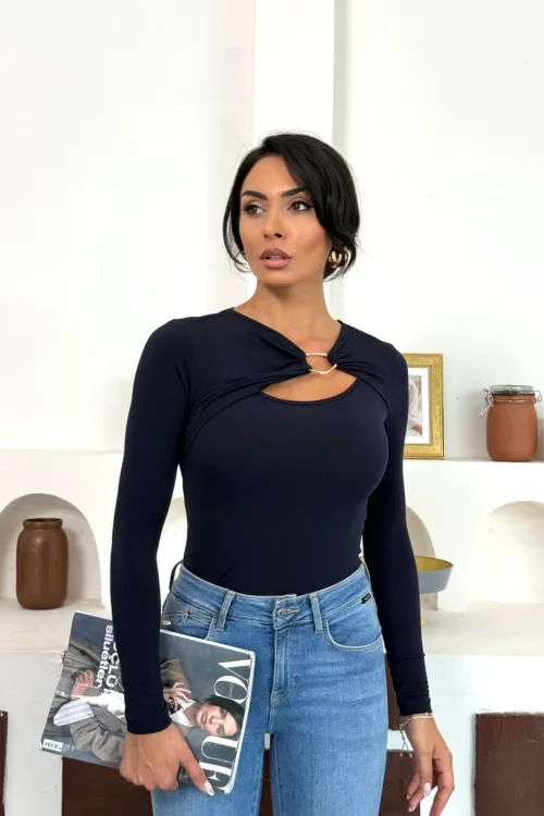 Lacivert Gold Aksesuarlı Göğüs Dekolteli Uzun Kollu Candy Body Bluz