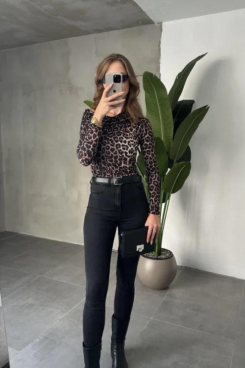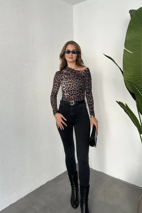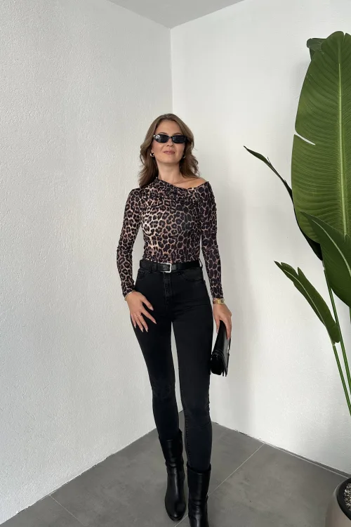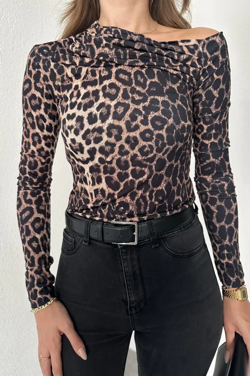 Leopar Tek Omuz Kayık Yaka Büzgülü Parmak Geçirmeli Body Bluz