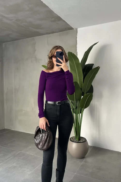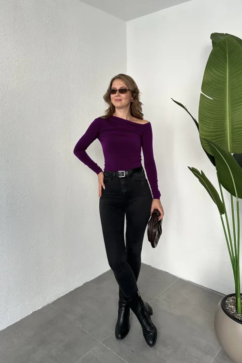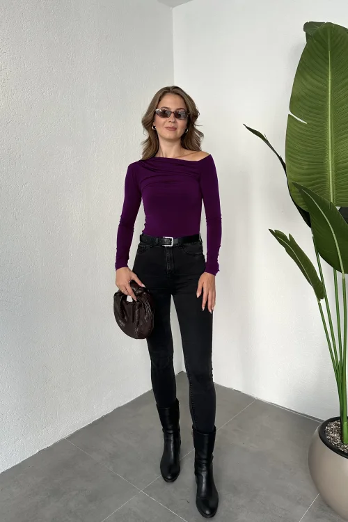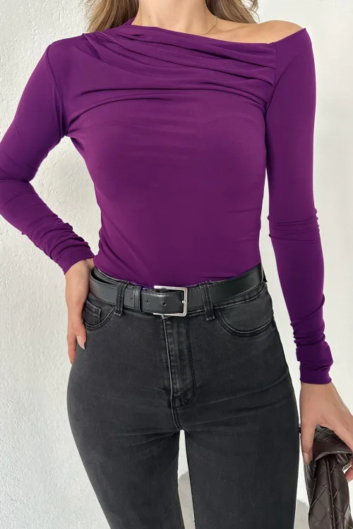 Mor Tek Omuz Kayık Yaka Büzgülü Parmak Geçirmeli Body Bluz