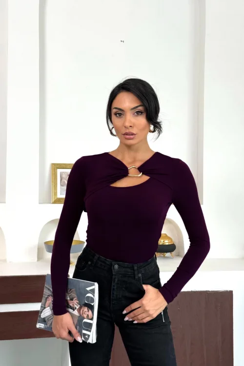 Mor Gold Aksesuarlı Göğüs Dekolteli Uzun Kollu Candy Body Bluz