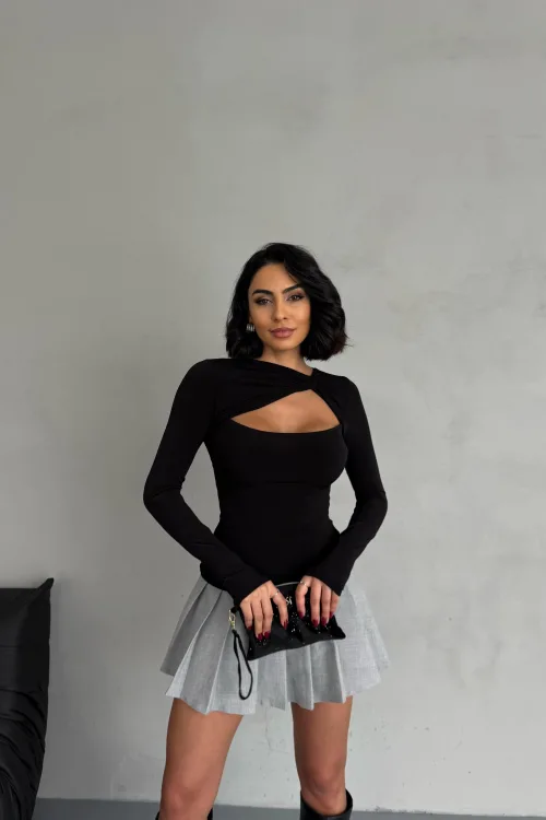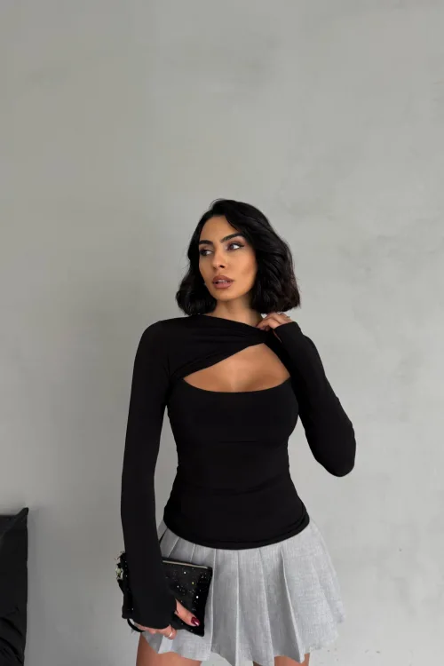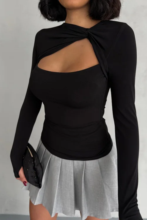 Siyah Burgu Detaylı Dekolteli Parmak Geçirmeli Body Bluz