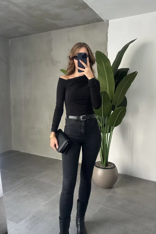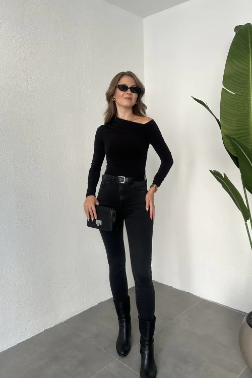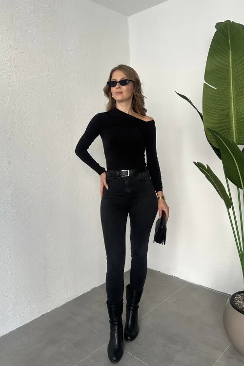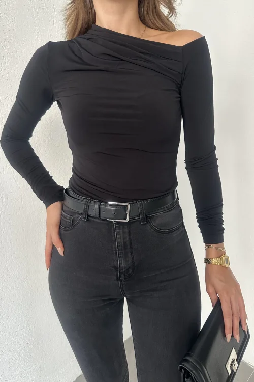 Siyah Tek Omuz Kayık Yaka Büzgülü Parmak Geçirmeli Body Bluz