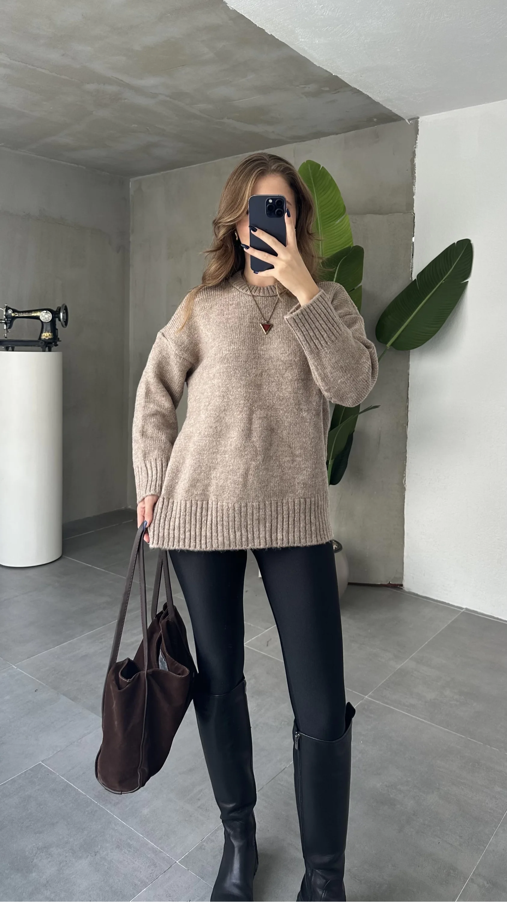 Kahverengi Bisiklet Yaka Tam Salaş Oversize Uzun Triko Kazak