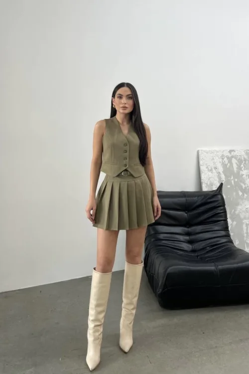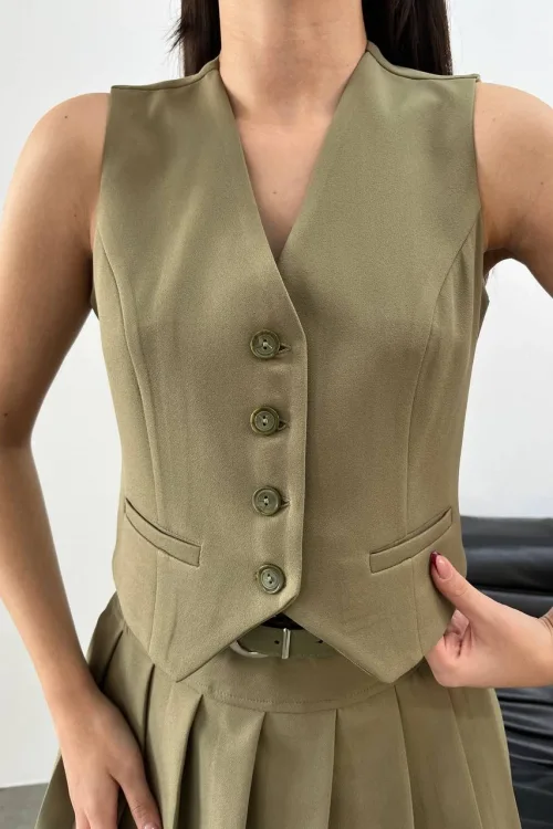 Haki Kolsuz Düğmeli Kısa Dokuma Klasik Yelek