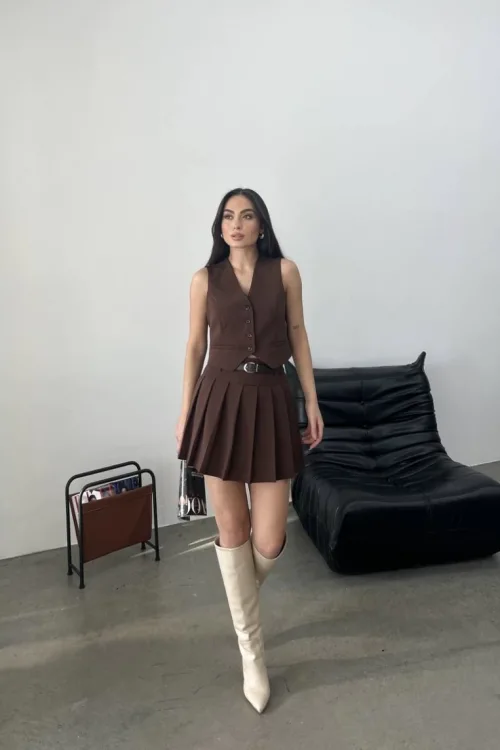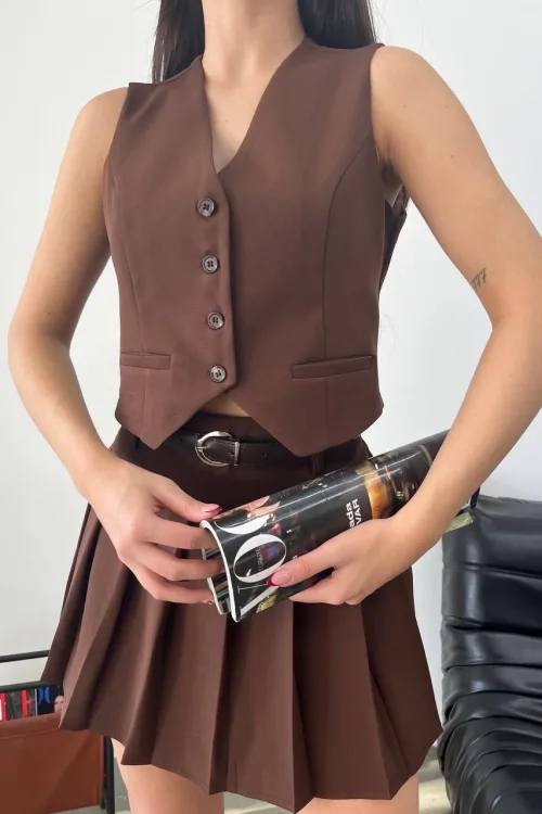 Kahverengi Kolsuz Düğmeli Kısa Dokuma Klasik Yelek