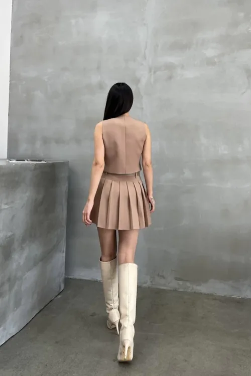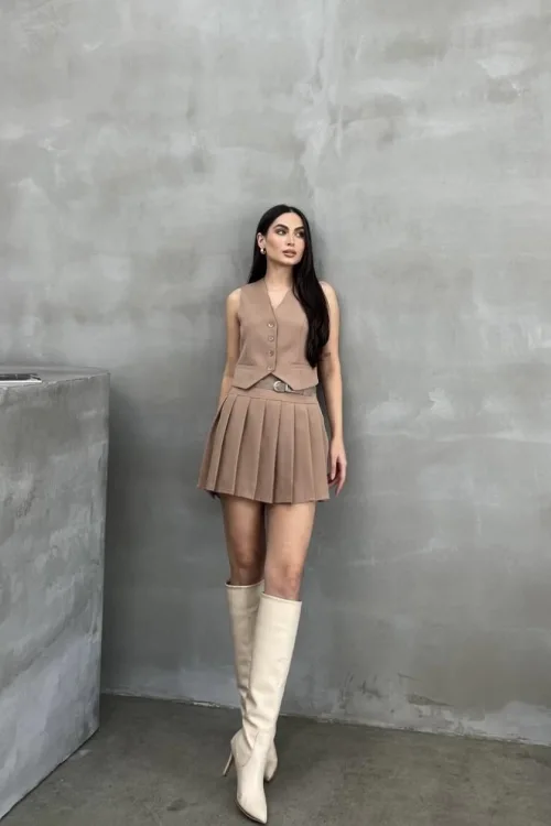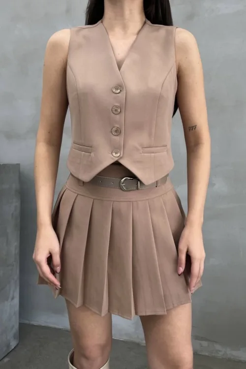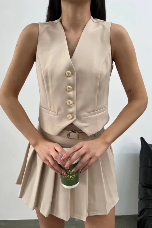 Krem Kolsuz Düğmeli Kısa Dokuma Klasik Yelek