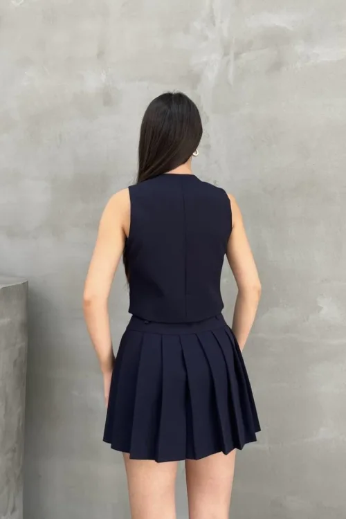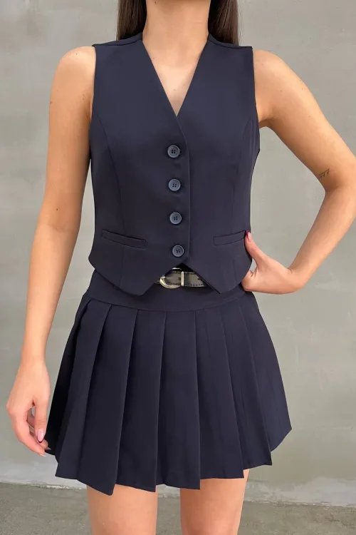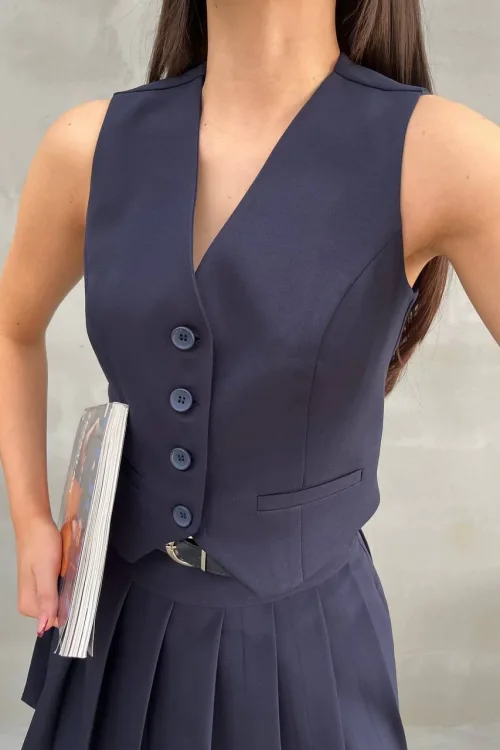 Lacivert Kolsuz Düğmeli Kısa Dokuma Klasik Yelek