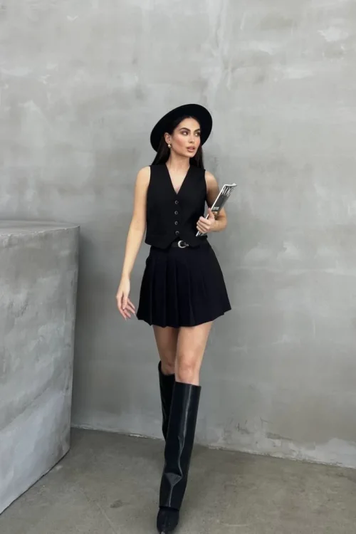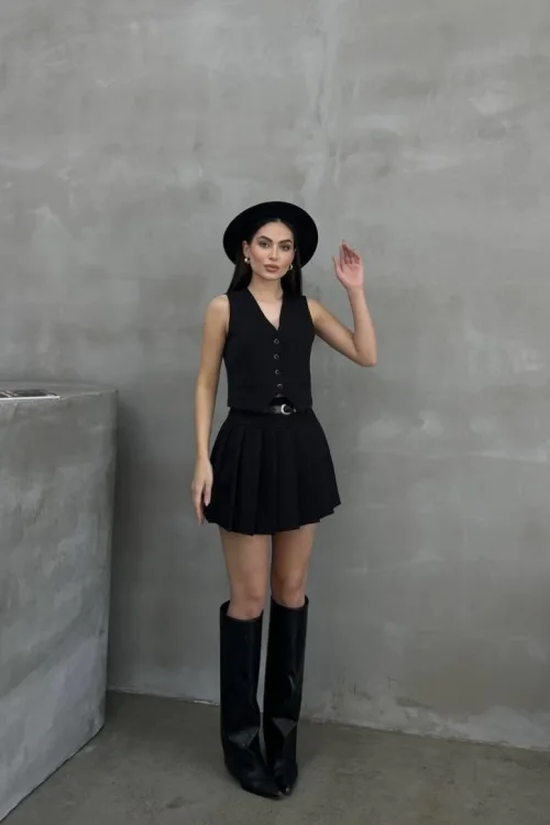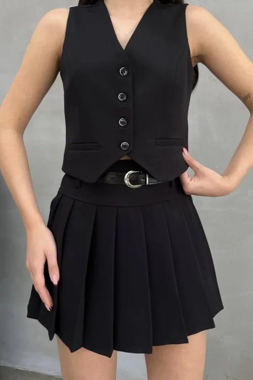 Siyah Kolsuz Düğmeli Kısa Dokuma Klasik Yelek